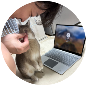 帰宅後、ペットのウサギを愛でる。